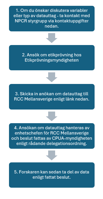 För att ansöka om dataåtkomst från NPCR skickas en ansökan om datauttag till Regionalt cancercentrum Mellansverige.