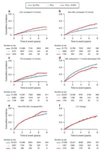 Figurtext: Kumulativ incidens av försämring av lipidnivåer (delfigurer a-e) och intensifiering av blodfettsänkande behandling (delfigur f) hos män utan prostatacancer, och hos män med prostatacancer (PCa) som fått hormonbehandling (GnRH) eller ej.