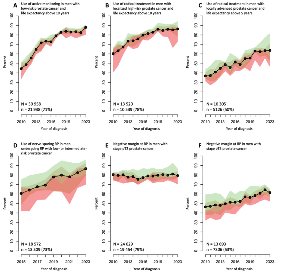 Studien visade att följsamheten till riktlinjerna har förbättrats avsevärt mellan 2010 och 2023. Andelen män med lågrisk prostatacancer och en förväntad återstående livslängd på över 10 år som följs med aktiv monitorering ökade markant från 44% 2010 till 88% 2023, och radikal behandling (operation eller strålning) för män med lokaliserad högrisk prostatacancer och en förväntad återstående livslängd på över 10 år ökade från 60% 2010 till 86% 2023 (figur). Användningen av nervsparande teknik vid radikal prostatektomi för män med lågrisk eller intermediärrisk prostatacancer ökade också betydligt.