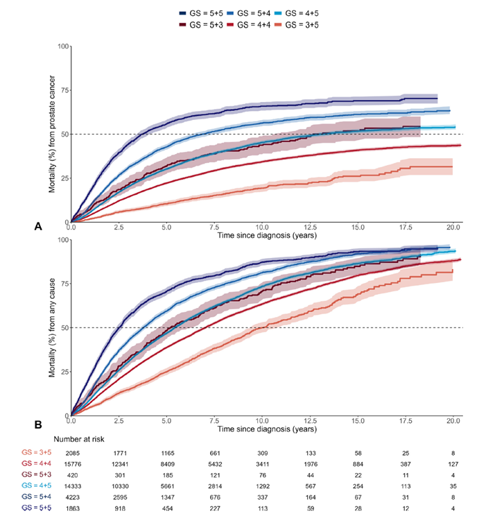 Studien, som baserades på 172 112 män diagnostiserade med prostatacancer, visade att det fanns betydande skillnader i prostatacancerdödlighet mellan män med Gleasonsumma 3+5, 4+4 och 5+3, som alla har ISUP-grad 4, samt mellan män med Gleasonsumma 4+5, 5+4 och 5+5 som alla har ISUP-grad 5 (figur). Den prostataspecifika mortaliteten hos män med Gleasonsumma 5+3 och 4+5 var 32% (95% konfidensintervall 27–36%) och 30% (29–31%), efter 5 år respektive 44% (39–49%) respektive 45% (44–46%), efter 10 år.