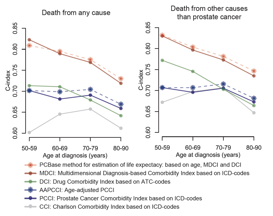 Studien baserades på 90 319 män i åldern 50–90 år som diagnostiserats med prostatacancer mellan 2012 och 2020. Fyra samsjuklighetsmått, Charlson Comorbidity Index (CCI), Prostate Cancer Comorbidity Index (PCCI), samt två nyutvecklade mått – MDCI (baserat på diagnoskoder) och DCI (baserat på läkemedelsdata), jämfördes med avseende på deras förmåga att förutse risken för död. Dessutom jämfördes två metoder för att uppskatta återstående livslängd: en åldersjusterad version av PCCI (AAPCCI) och PCBase-metoden, som kombinerar MDCI, DCI och ålder. MDCI och PCBase-metoden hade bäst förmåga att förutsäga död, särskilt jämfört med CCI och PCCI (figur). AAPCCI missade att korrekt identifiera många män med kort livslängd i förhållande till PCBase-metoden.